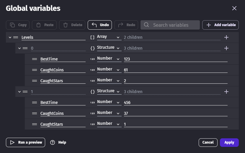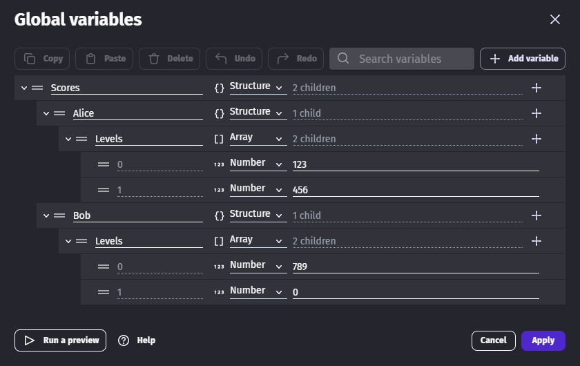 Structures can be created in the Variables Editor, using events or by using an extension like JSON resource loader.