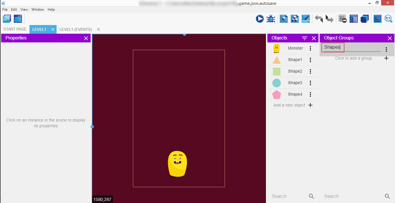 The three values we will enter are: "Text representing the name of the object to create", "X position", and "Y position". Name it "Shape" + ToString(RandomInRange(1,4)), so that whenever a new object is created, it will be one of the four available shapes.