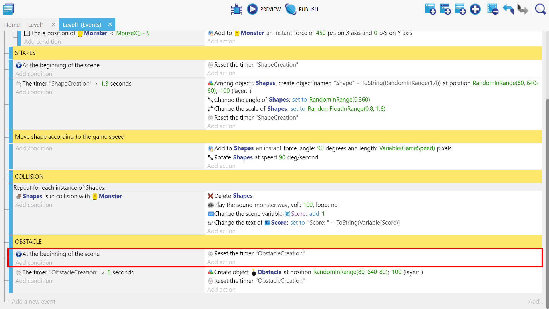 Next create a new event above the obstacle event and give it the condition “at beginning of the scene”, and copy/paste the earlier create “Start (or reset) a scene timer” action for “ObstacleCreation” to this new event. This will start the timer at the beginning of the game in so the obstacle event will trigger the first time.